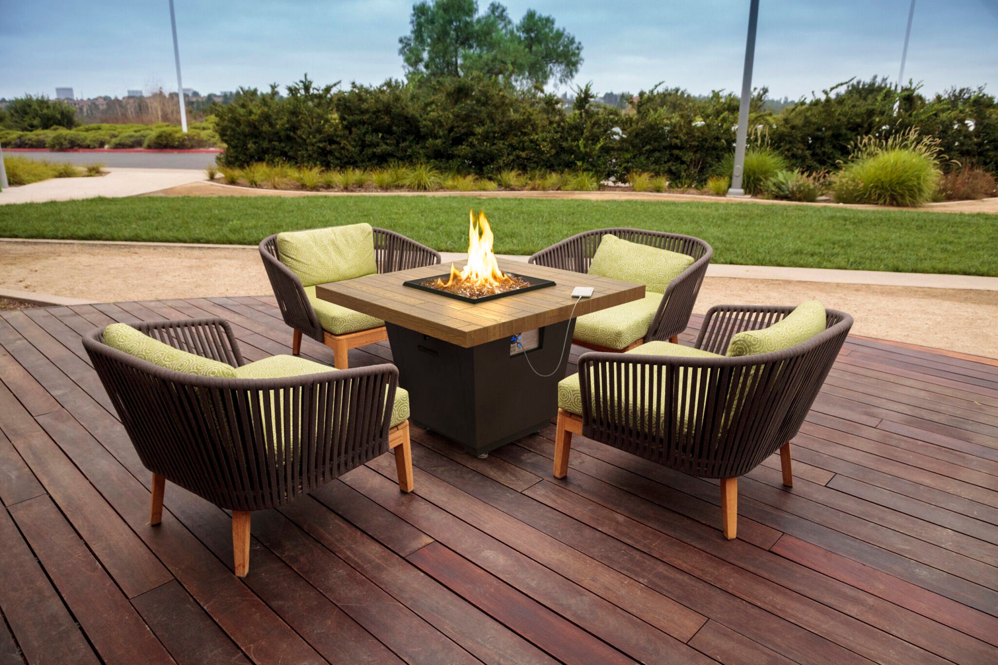 Enhance your outdoor ambiance with the American Fyre Designs 36-inch Cosmopolitan Square Fire Table. Its sleek design and warm glow create the perfect setting for cozy gatherings and elegant evenings.